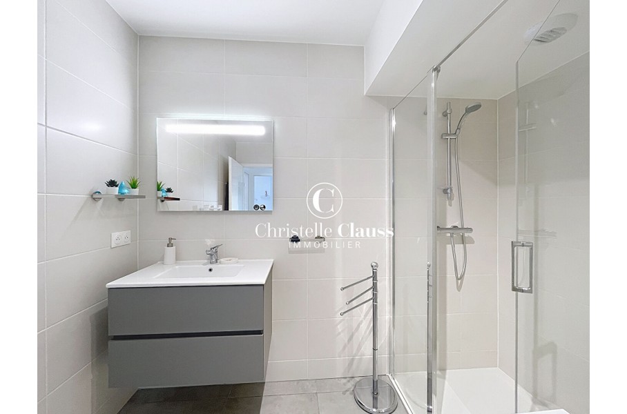 L'espace nuit se compose de 2 chambres dont l'une comprend un placard intégré sur mesure. La salle de bain est équipée d'une douche moderne et d'un meuble vasque, avec WC séparé.