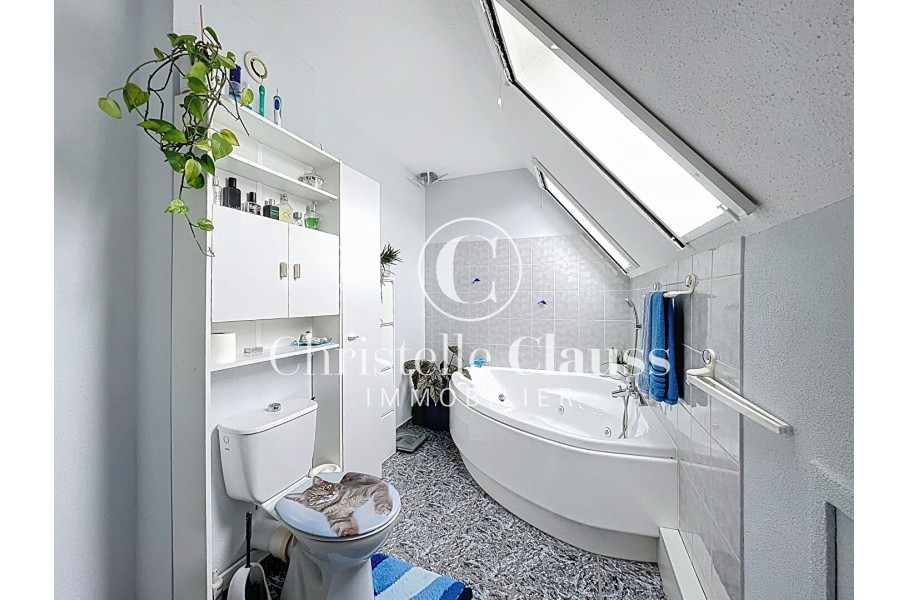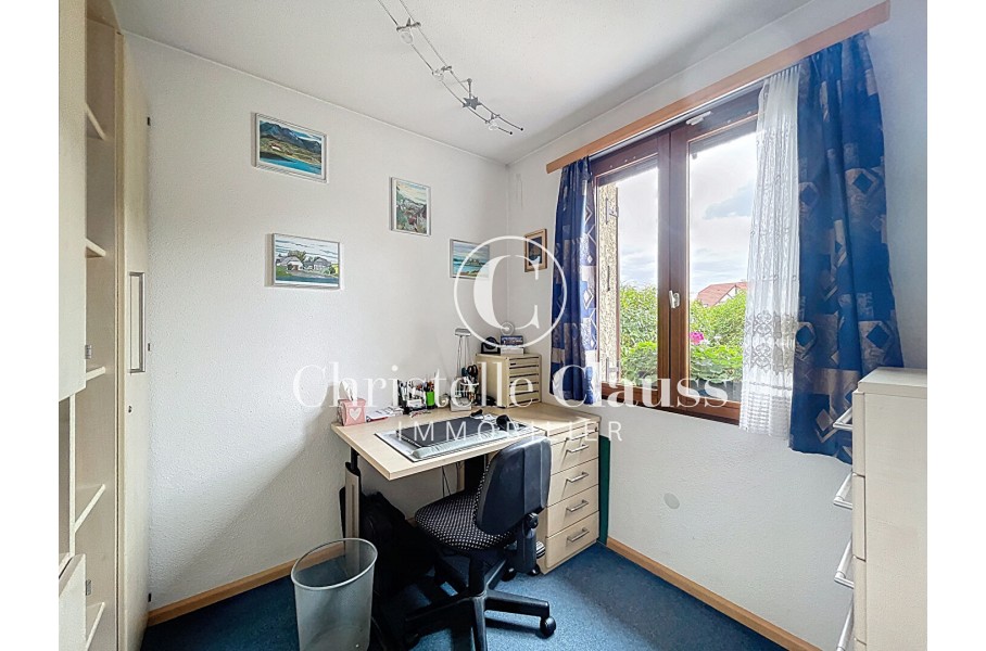 L'étage compte deux chambres lumineuses ainsi qu'une salle de bain avec une baignoire spacieuse et un WC. Une des deux chambres de l'étage est aménageable en troisième chambre si nécessaire.