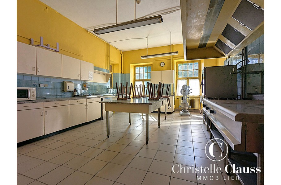 - Au rez-de-chaussée : deux vastes salles en enfilade (d'env. 70 m² chacune), cuisine de 33m², bureau...