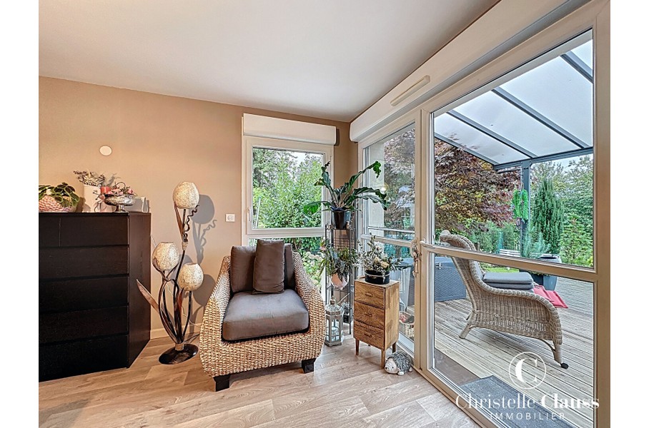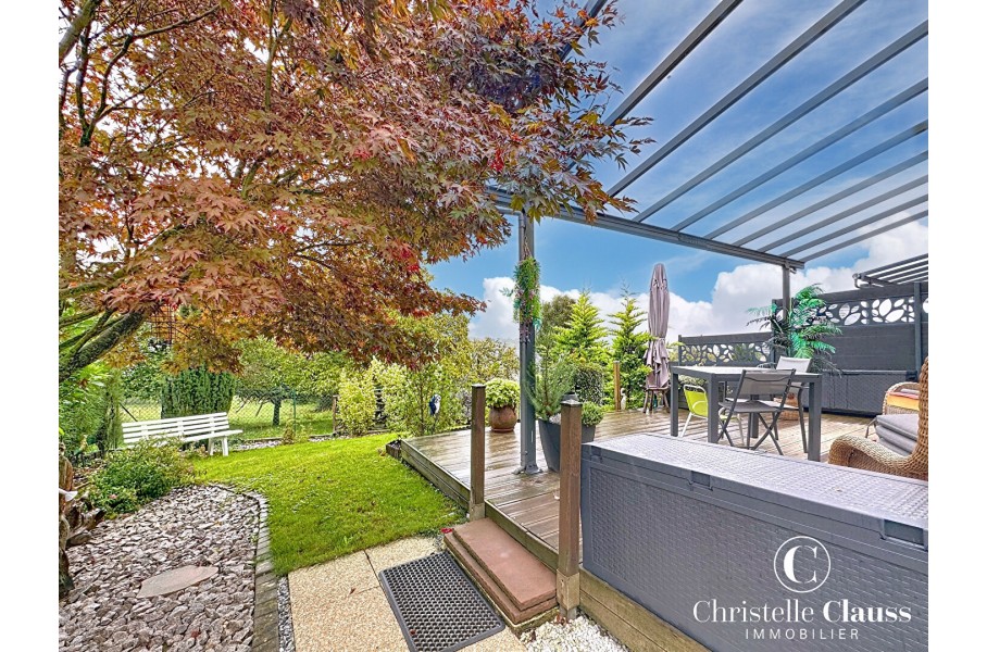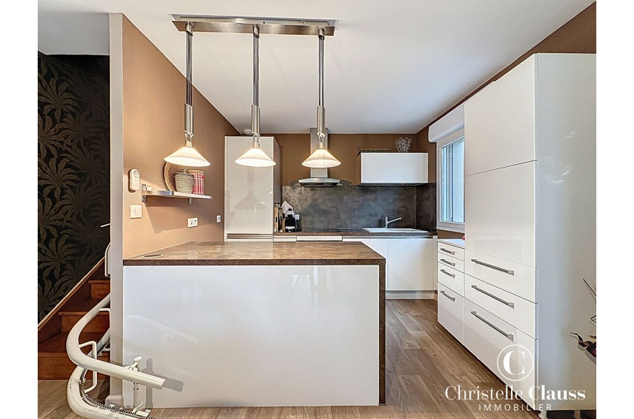 Il se compose au rez-de-chaussée d'une entrée avec WC séparé, d'un grand et lumineux séjour avec une cuisine américaine Schmidt entièrement équipée d'environ 35m², offrant un accès direct à la terrasse avec pergola et au jardin, un espace convivial et chaleureux pour partager de bons moments en famille ou entre amis