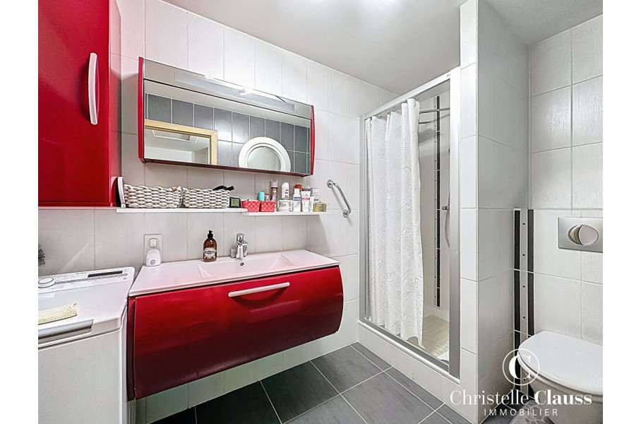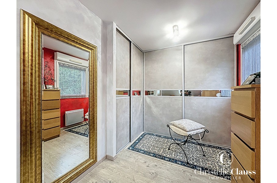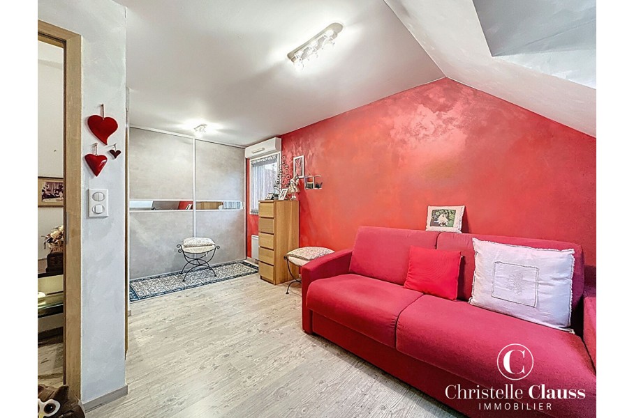 A l'étage, vous trouverez deux chambres dont une avec un grand dressing sur mesure d'angle, ainsi qu'une salle d'eau équipée d'une grande douche et d'un WC suspendu, alliant confort et fonctionnalité