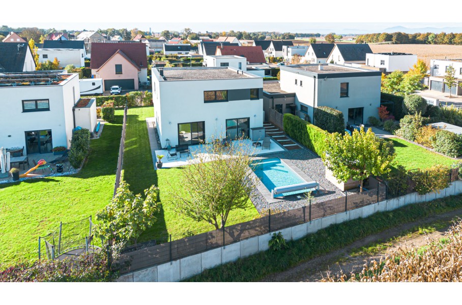 Nichée dans un environnement paisible, au coeur d'un petit lotissement recherché d'Ichtratzheim, cette villa contemporaine de 180 m² séduit par son raffinement, ses prestations haut de gamme et son cadre de vie idyllique avec vue dégagée sur les champs.