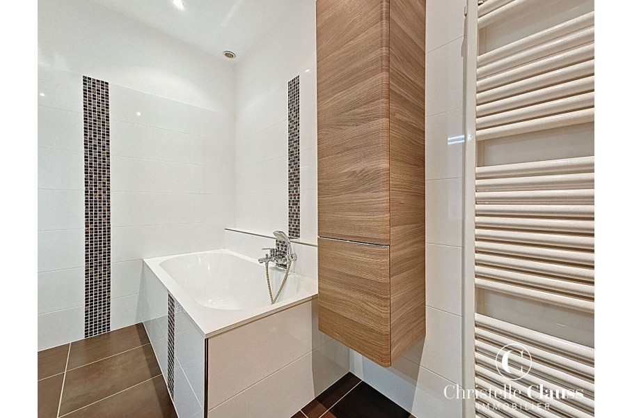 Il dispose d'une belle entrée distribuant la salle de bain contemporaine, le salon séjour avec cheminée fonctionnelle ainsi que sa cuisine Schmidt totalement équipée.