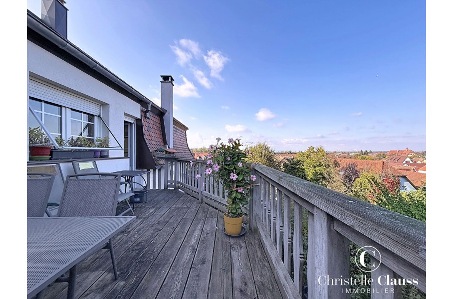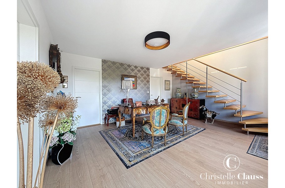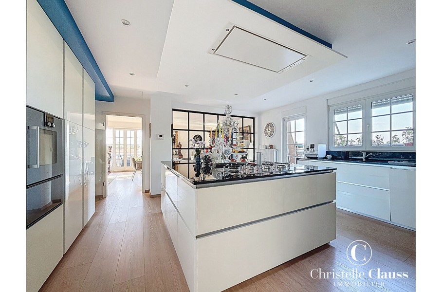 Une cuisine haut de gamme, entièrement équipée avec des matériaux et électroménagers de qualité, bénéficie d'un accès direct à la terrasse pour profiter pleinement des repas en extérieur et de la vue panoramique. Ainsi qu'un espace salon de 12.50 m² permettant de faire une 5ème chambre, un cellier et un wc indépendant.