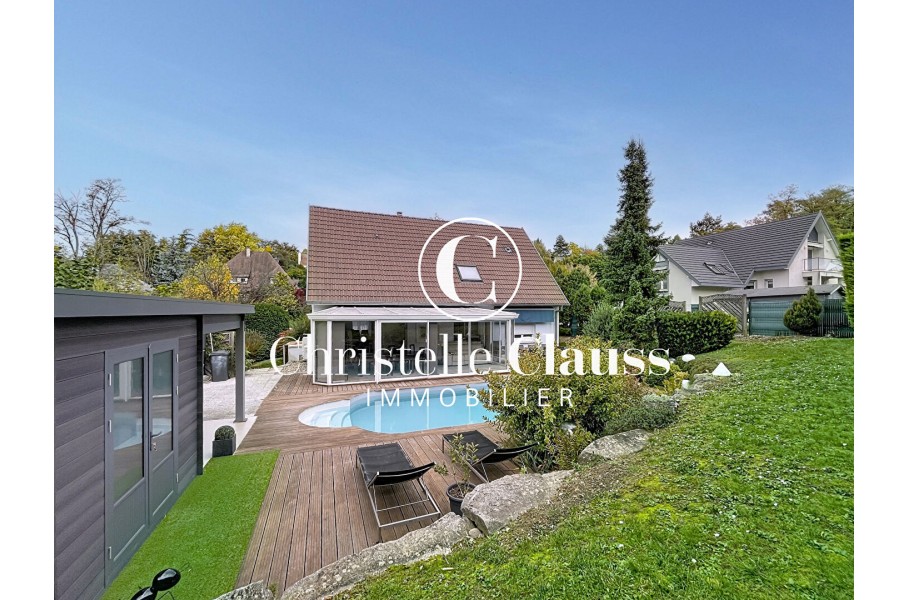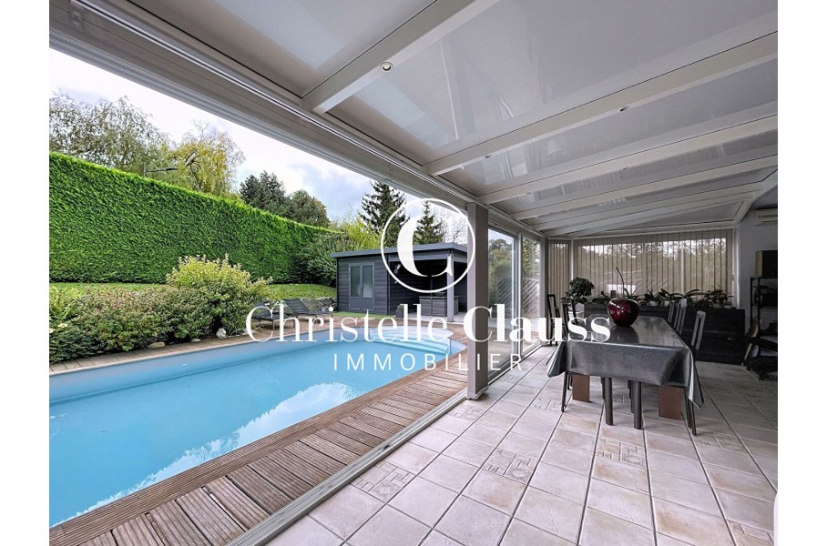 Au rez-de-chaussée, une entrée accueillante dessert un grand séjour lumineux, prolongé par une véranda vitrée donnant sur la piscine et le jardin arboré et clos. La cuisine indépendante, aménagée et équipée, bénéficie également de cette vue apaisante. Une chambre, une salle de bain, et un WC indépendant complètent ce niveau, avec accès au sous-sol.