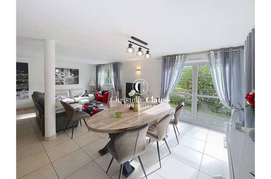 L'espace de vie se prolonge sur une terrasse dallée d'environ 11 m² donnant sur un jardin clos de 140 m², idéalement exposé sud-ouest pour profiter du soleil tout au long de la journée.