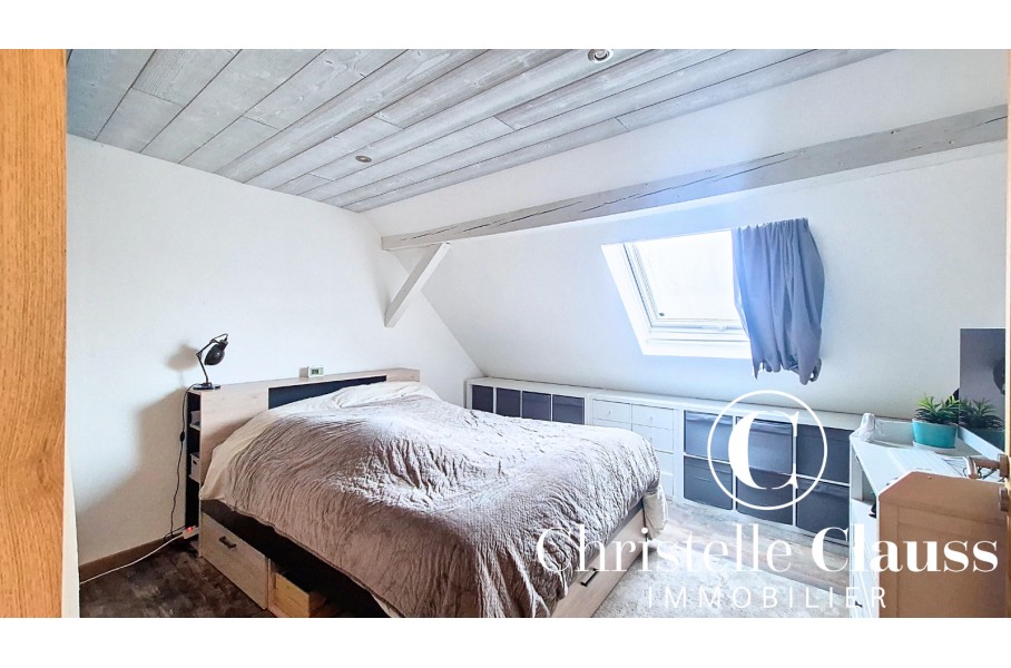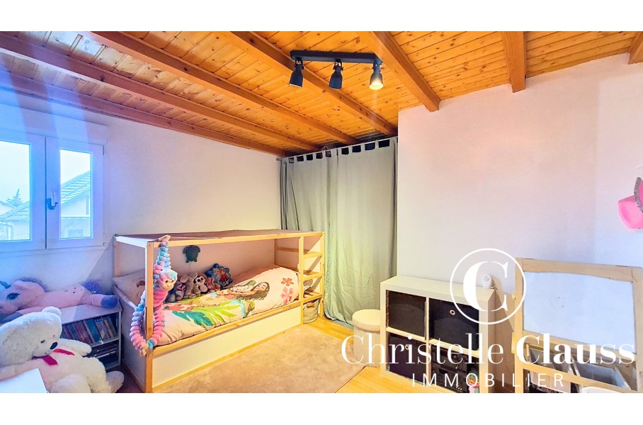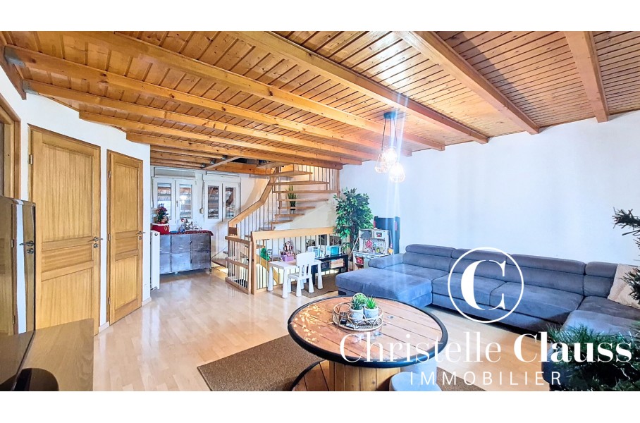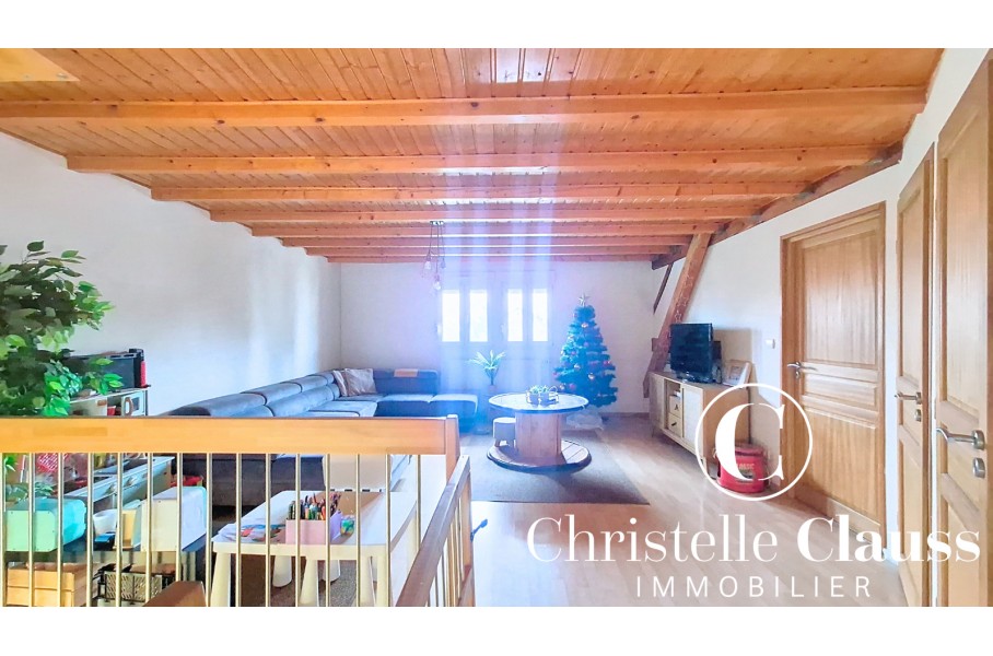 Au premier niveau, vous découvrirez un vaste salon à l'atmosphère chaleureuse, ainsi qu'une chambre dotée de son propre espace dressing. L'escalier associant bois massif et métal crée une transition esthétique entre les étages.