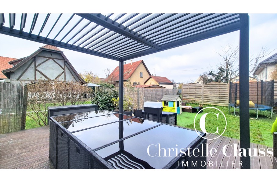 Le rez-de-chaussée accueille une belle pièce de vie ouverte composée d'un séjour lumineux et d'une cuisine moderne. Une large baie vitrée permet un accès direct à la terrasse et au jardin paysager, agrémentés d'une pergola offrant un espace extérieur intime et parfaitement aménagé pour les moments en famille ou entre amis.