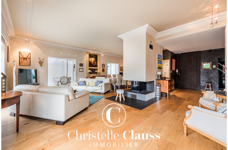 Ce bien unique séduit immédiatement par ses volumes exceptionnels et son ambiance chaleureuse : un salon de 60 m² doté d'une cheminée centrale, une magnifique hauteur sous plafond, un parquet en chêne massif sur toute la surface, ainsi que de nombreux rangements intégrés.