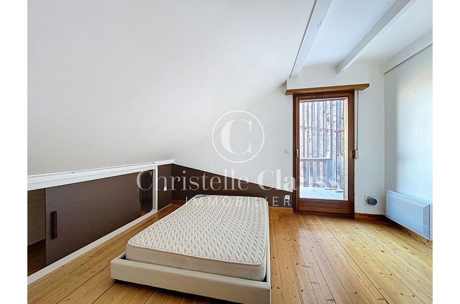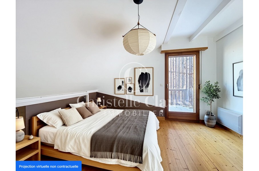 A l'étage, l'espace nuit se compose de deux chambres confortables, dont une équipée d'un placard intégré. Chaque chambre bénéficie d'un accès direct à une terrasse ou un balcon, offrant une belle ouverture sur l'extérieur. Une salle d'eau avec WC vient parfaire cet étage.
