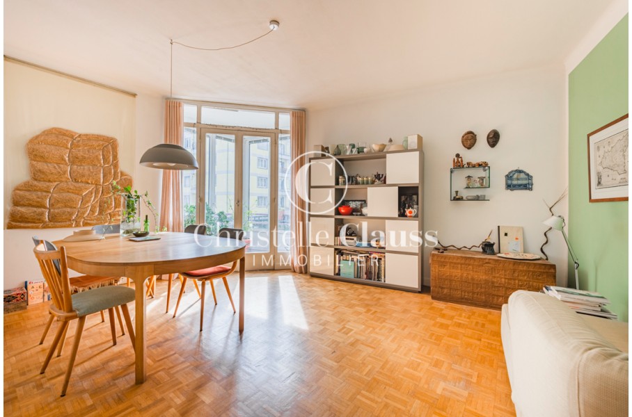 Appartement de 4 pièces pour une superficie de 94m², il est composé d'une entrée spacieuse, une cuisine aménagée avec une loggia donnant sur la cour intérieure, un salon/séjour avec une deuxième loggia orientée sud en angle du bâtiment, 2 à 3 chambres suivant vos nécessités, une salle d'eau spacieuse bien conçue et un WC séparé.
