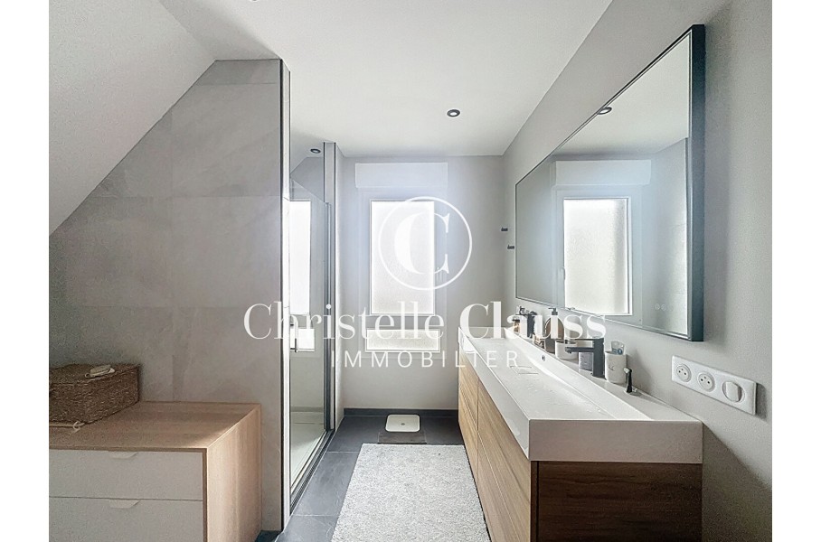 A l'étage, un dégagement dessert 3 belles chambres de 14,13 et 12,5 m² dont une avec dressing. Une salle d'eau avec wc et double vasques. Une buanderie est également prévue au niveau des chambres pour vous faciliter les tâches quotidiennes.