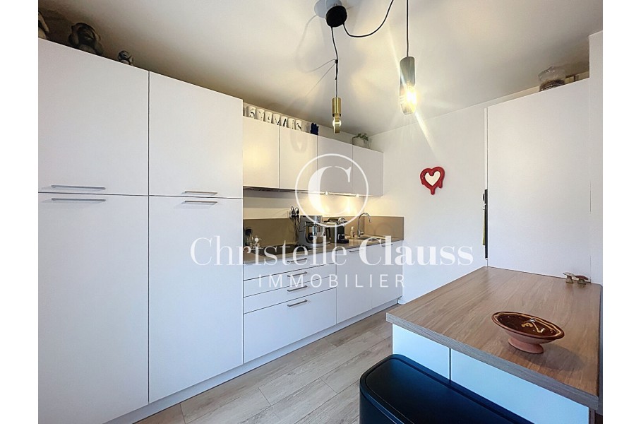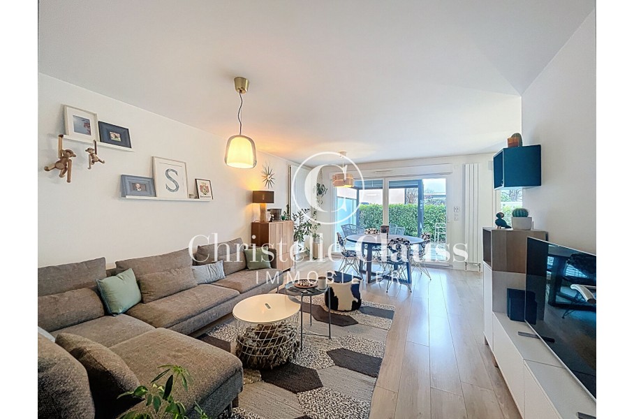 L'appartement se compose d'un grand salon lumineux, ouvert sur une cuisine moderne, entièrement équipée, offrant un espace de vie convivial et fonctionnel. Depuis le salon ou la cuisine, vous bénéficiez d'un accès direct au jardin, parfait pour profiter pleinement des beaux jours.