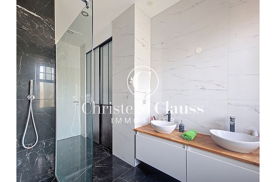 Au 1er étage : grand salon lumineux avec écran projecteur, 2 chambres et salle d'eau avec double vasque et douche à l'italienne.