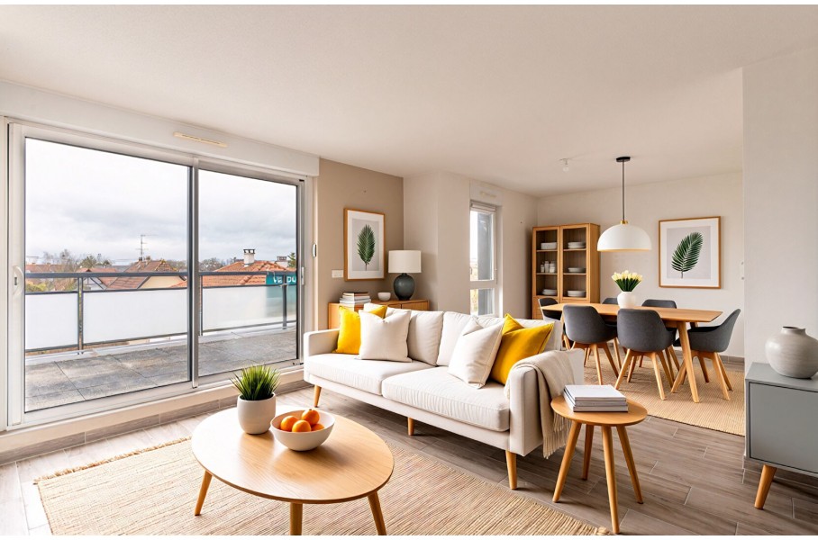 L'appartement s'ouvre sur une grande terrasse orientée Ouest, équipée d'un store électrique, bénéficiant d'une vue dégagée, parfaite pour profiter des fins de journée ensoleillées.