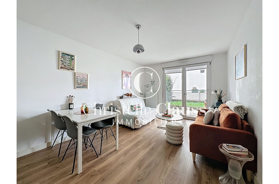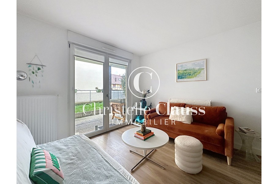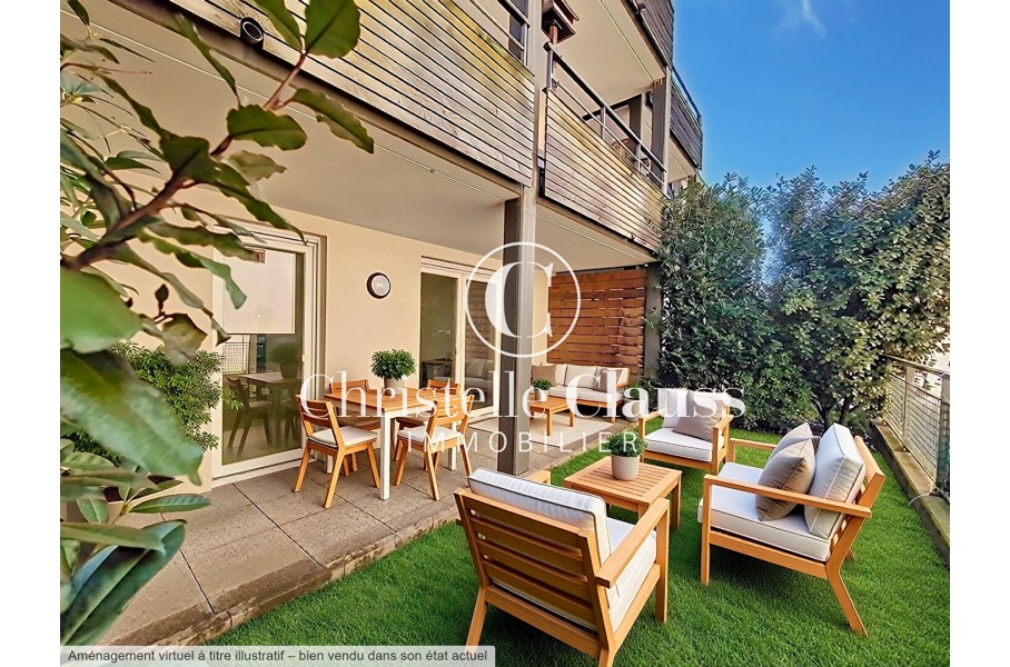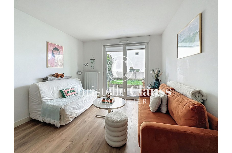 Vous profitez d'une terrasse couverte de 11m² orientée ouest avec un petit jardin de 19m² accessibles depuis le séjour et la chambre.