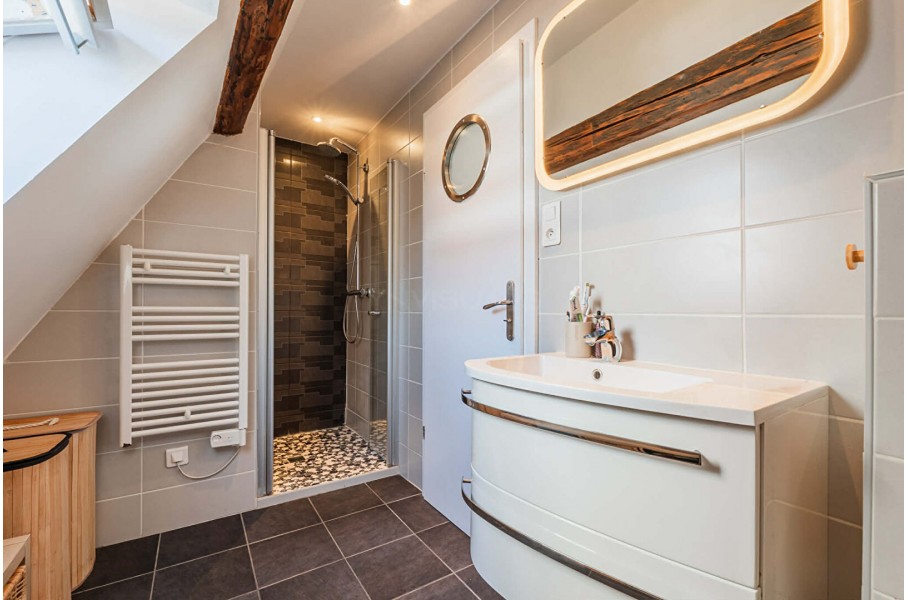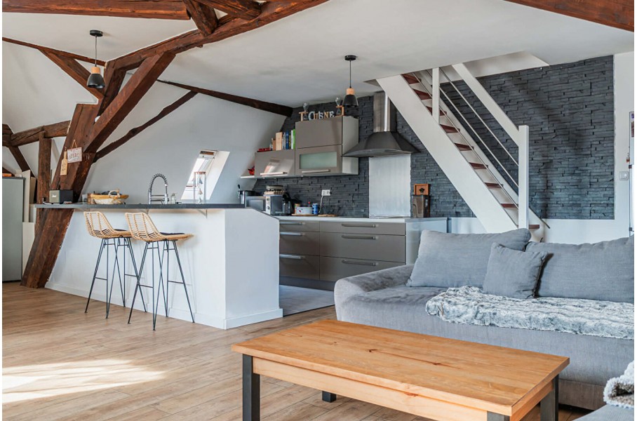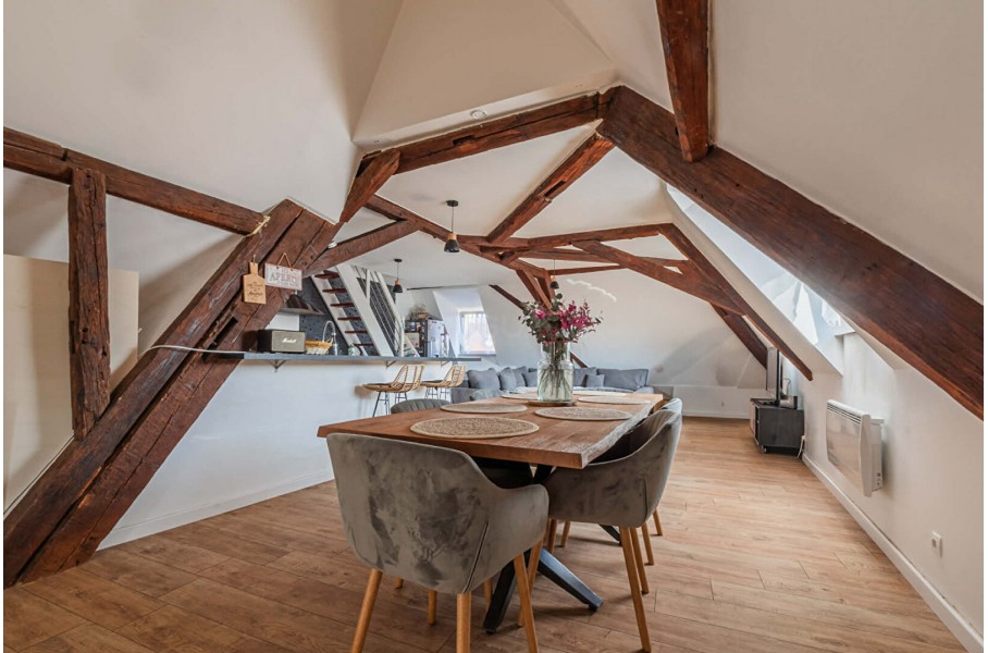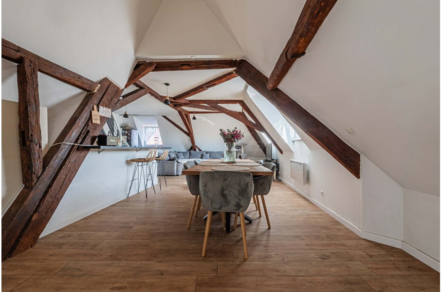 En montant l'escalier, vous découvrirez une magnifique pièce de vie de 57 m² habitables et 71 m² au sol, avec une très belle hauteur sous plafond et des poutres apparentes, offrant un cachet exceptionnel. Cette pièce comprend un espace bureau, un salon, une salle à manger ainsi qu'une cuisine entièrement équipée et aménagée.