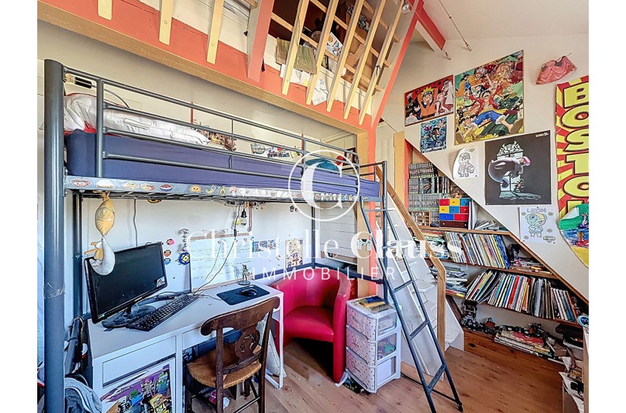 Situé au premier et dernier étage, un dégagement dessert le séjour équipé d'un poêle à bois avec accès à un balcon, une cuisine équipée indépendante attenante avec possibilité d'ouverture, une salle de bains avec WC, un espace bureau, une salle d'eau, une grande chambre, et une chambre d'enfants avec mezzanine.