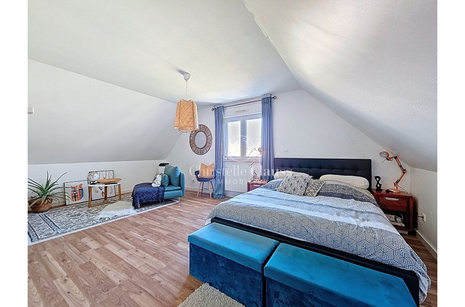 - à l'étage, 3 chambres dont un grande chambre parentale avec son dressing ! Toujours au même étage, une belle salle de bain avec douche et baignoire et une double vasque, wc. Possibilité de créer une 4e chambre si besoin au dessus de l'extension.