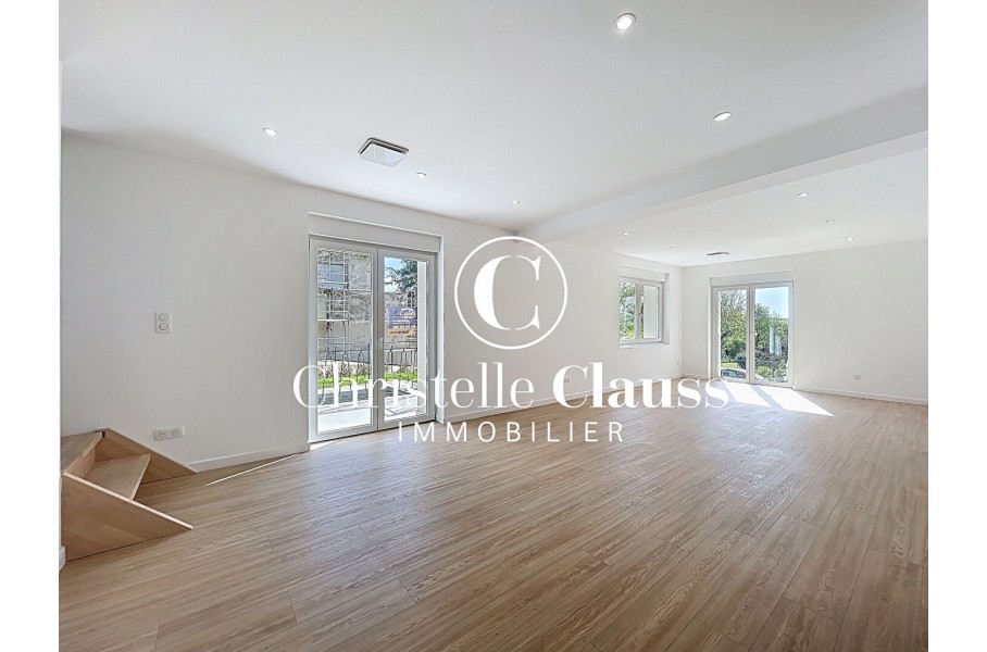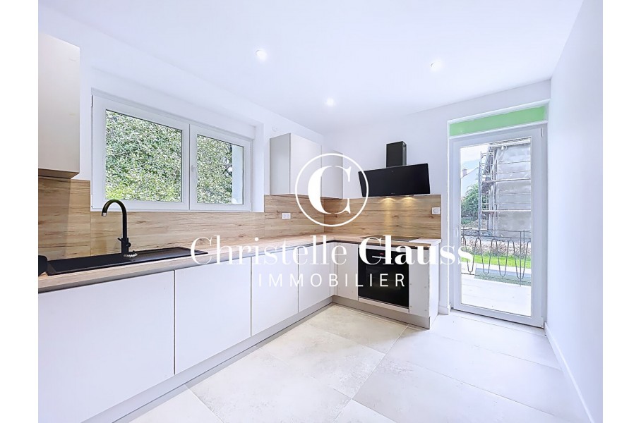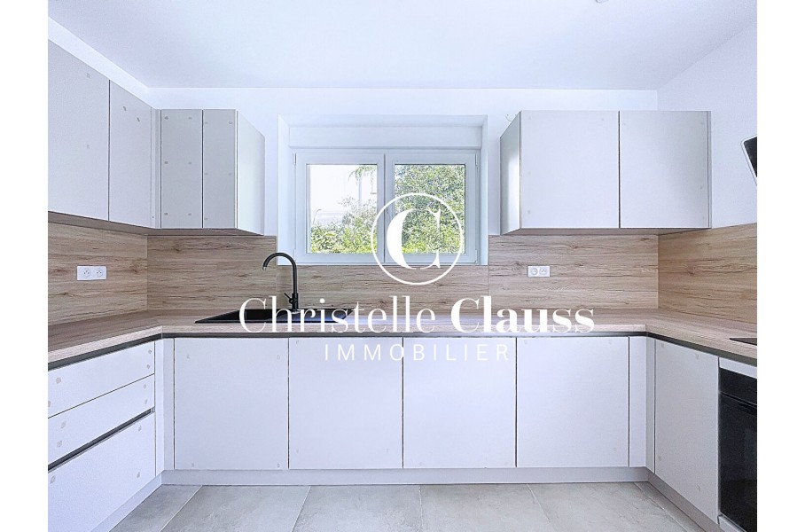 Le rez-de-chaussée propose un vaste salon-séjour lumineux avec accès direct à la terrasse, ainsi qu'une cuisine neuve, parfaitement équipée, également ouverte sur l'extérieur.