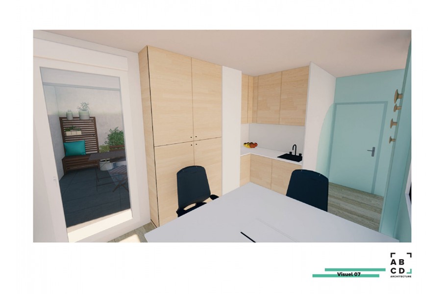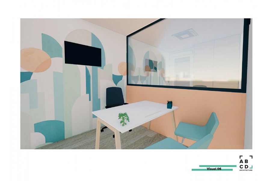 Entrée avec accueil, 2 bureaux vitrés, un espace de travail à l'arrière avec cuisine équipée et accès à une petite cour fermée à l'abris des regards.