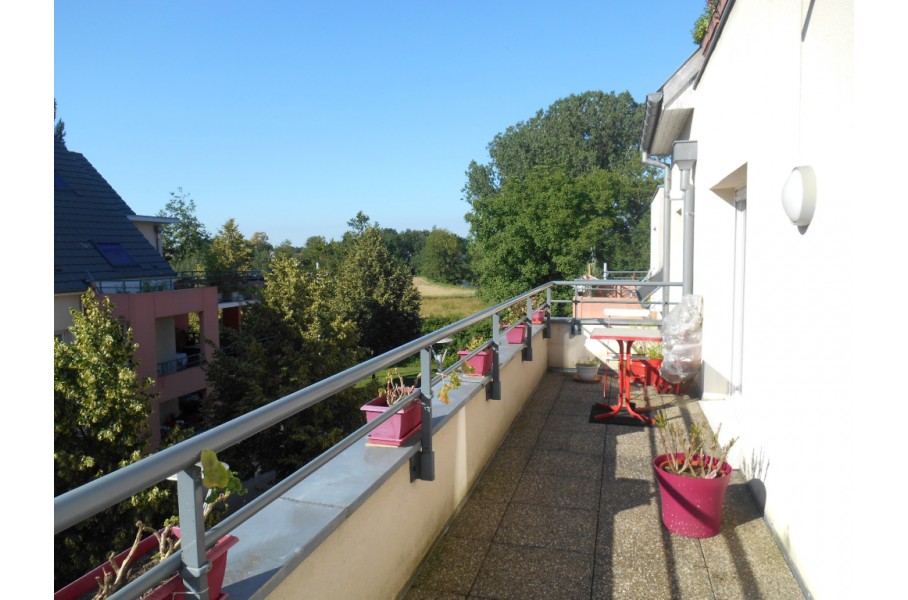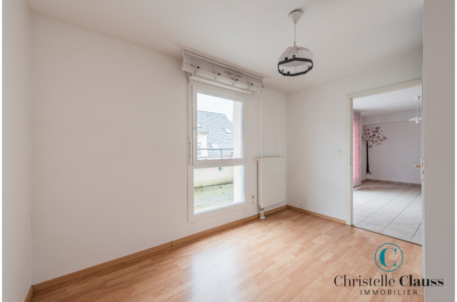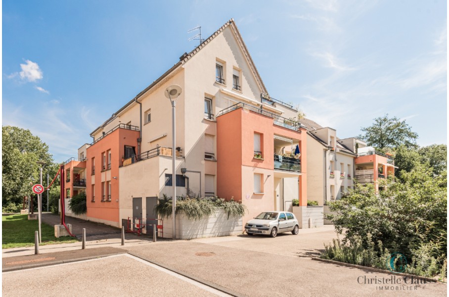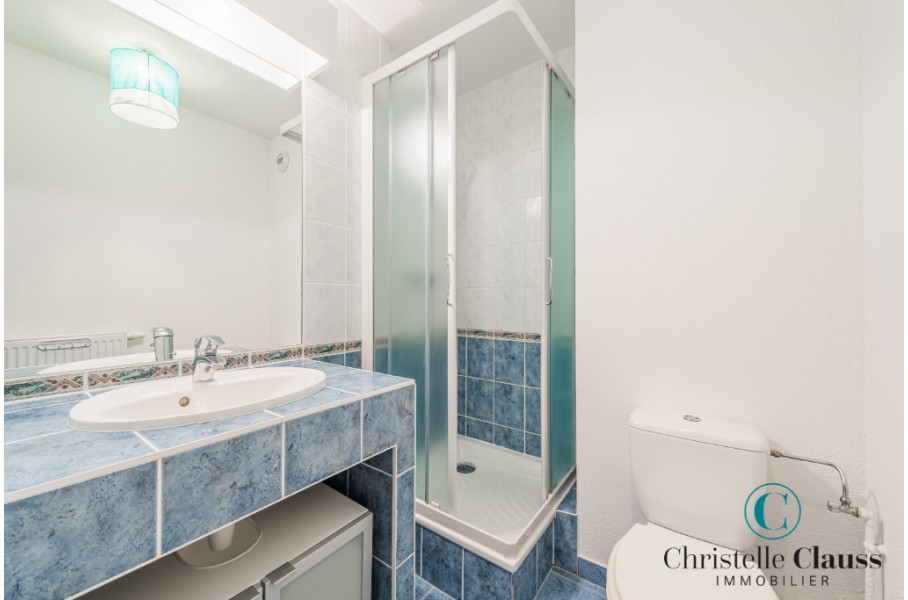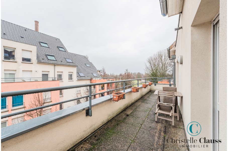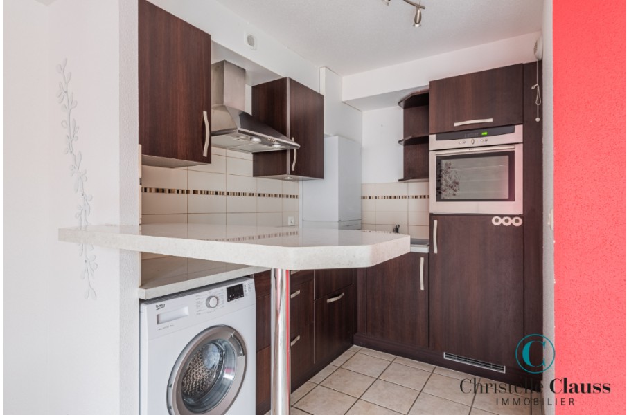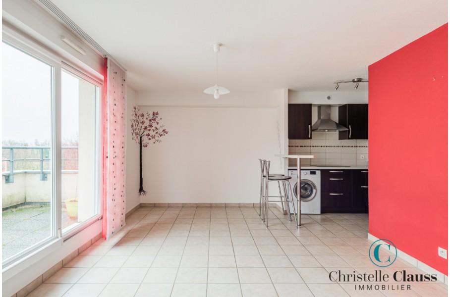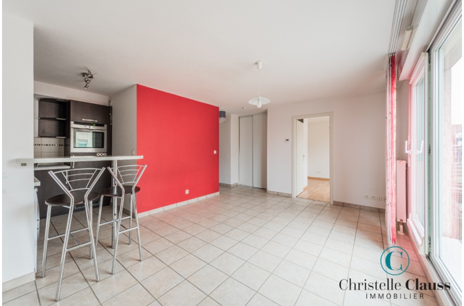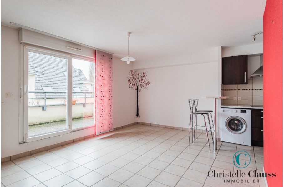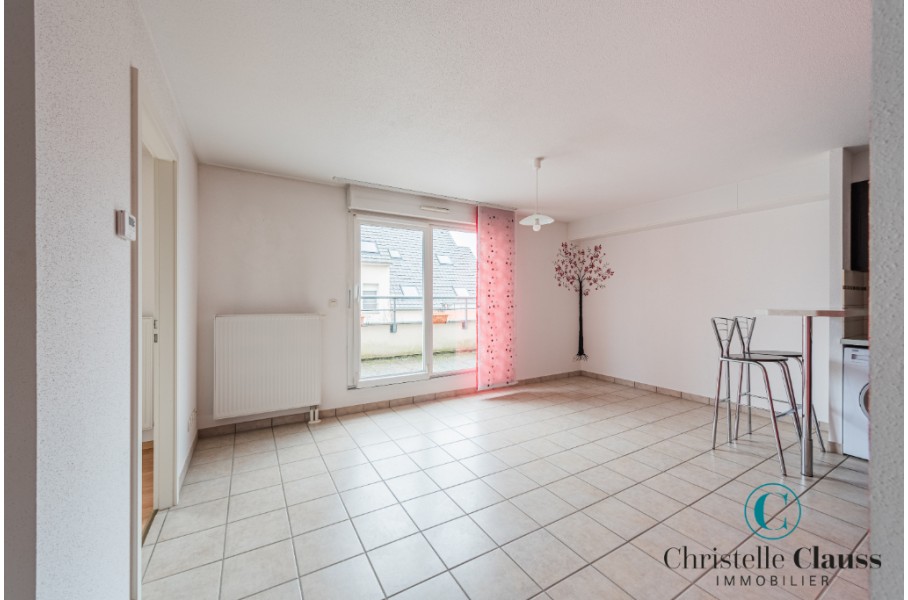 ERSTEIN: Situé rue Emile Zola, lumineux 2 pièces de 38,39m² comprenant une entrée avec placards, une salle d'eau avec douche et WC, une cuisine équipée (mobilier, four, plaques, hotte) ouverte sur le séjour avec accès terrasse de 14m², une chambre avec placard.