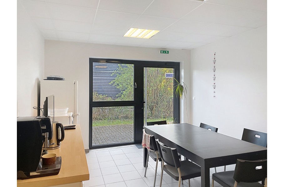 un hall d'entrée / accueil, 4 bureaux, une salle de réunion, une cuisine avec accès à une terrasse, un débarras, une salle d'archives