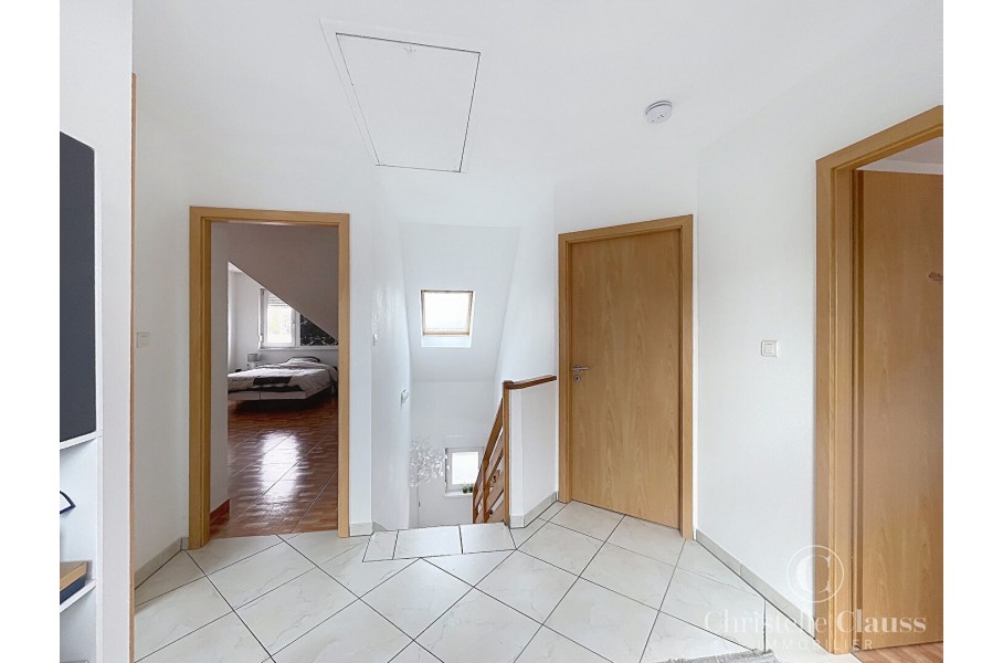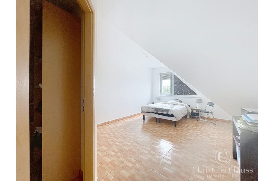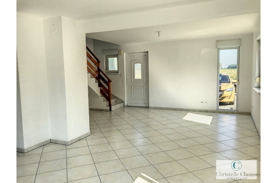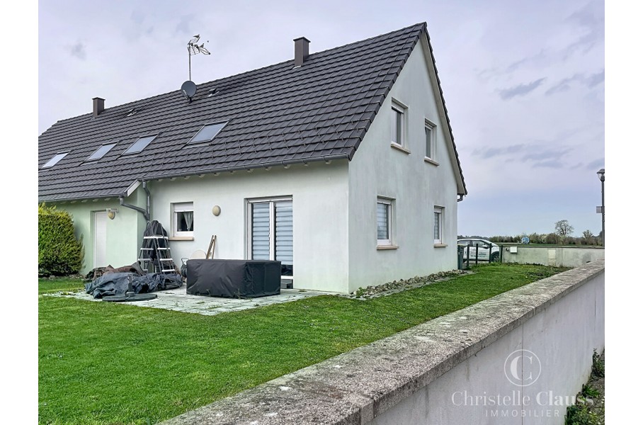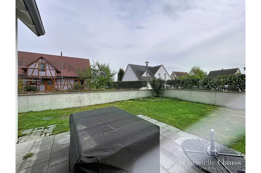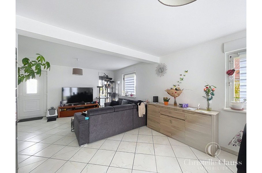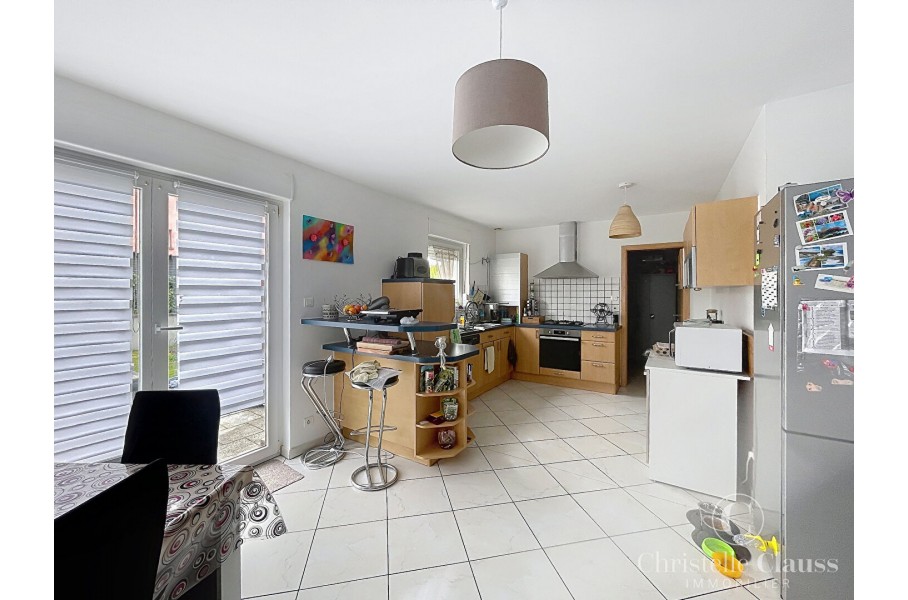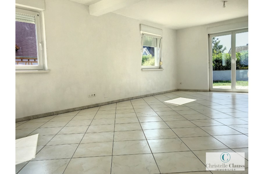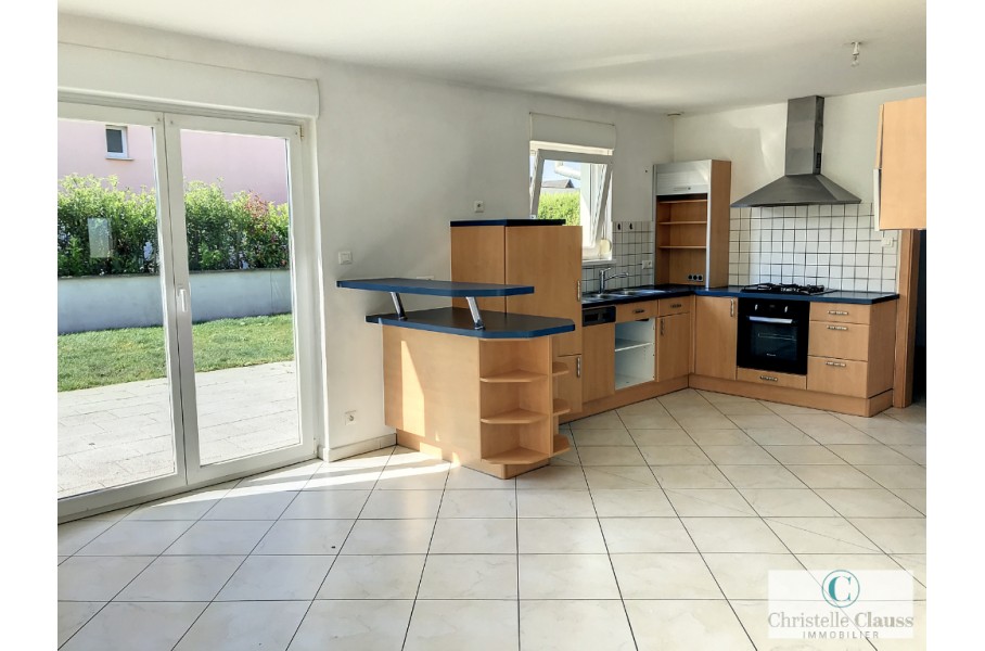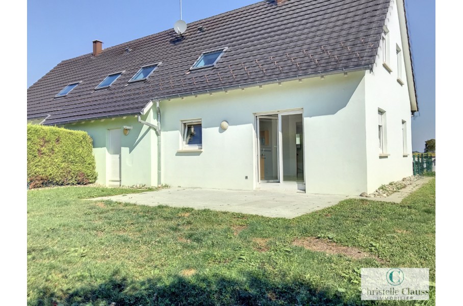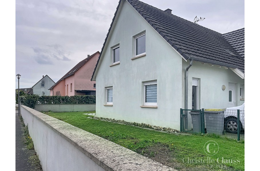 MUSSIG : Maison 4 pièces au calme de 107m², sur une parcelle de 3.5 ares, mitoyenne par le garage. Au rez de chaussée, elle se compose d'une entrée, un salon séjour ouvert sur une cuisine aménagée et équipée (mobilier, lave vaisselle, frigo, hotte, plaque de cuisson, four), un WC avec meuble vasque, un cellier et un accès à la terrasse et au jardin.