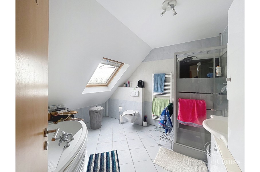 A l' étage : 3 chambres dont une avec un dressing, une salle de bain avec douche et baignoire d' angle, WC et un sèche serviette, et un dégagement. Une trappe pour l' accès au grenier isolé.