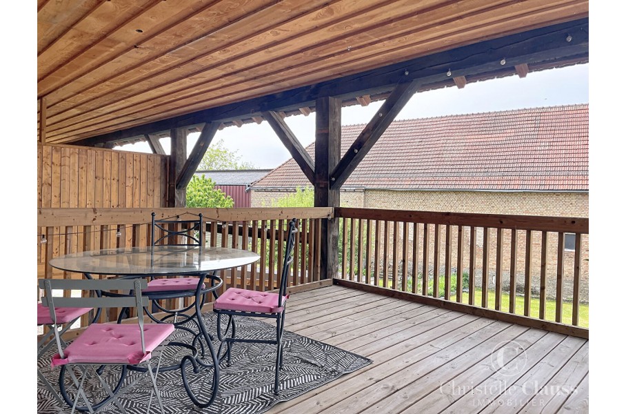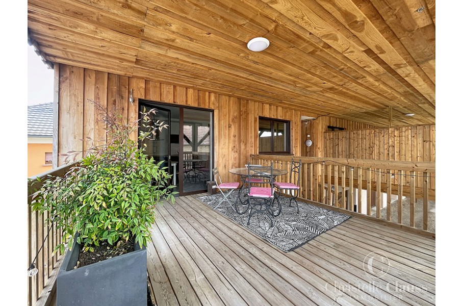 L'appartement 1 er étage se compose d'une entrée avec placard, une belle cuisine équipée ouverte sur séjour avec accès sur une grande terrasse couverte de 18.55m², une chambre, une salle d'eau et wc séparés.